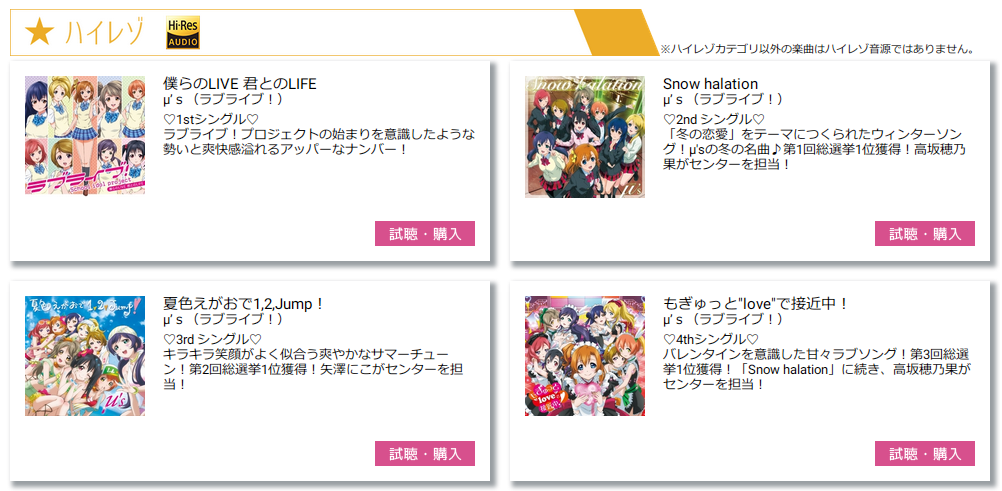 1st~5thシングル、TVアニメ1期のOPED/挿入歌、「Mermaid festa vol.2 ~Passionate~」などのデュオ・トリオシングルや、「Love marginal」などのユニットシングル第1弾は以前から”ハイレゾ”として配信されていましたが、より高品質なフォーマットで新しく配信されなおす形となります。