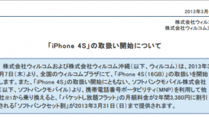つまりウィルコムが取り扱いを開始といっても、ウィルコムプラザ内でソフトバンクのiPhone 4Sの契約ができるようになっただけである。まだまだ4Sの在庫が大量に残っているための策なのだろうか。いっそイー・モバイルでも取り扱いを開始して、まさにドコモ以外全ての国内キャリアが取り扱っている、という状態を見てみたい気もするが…